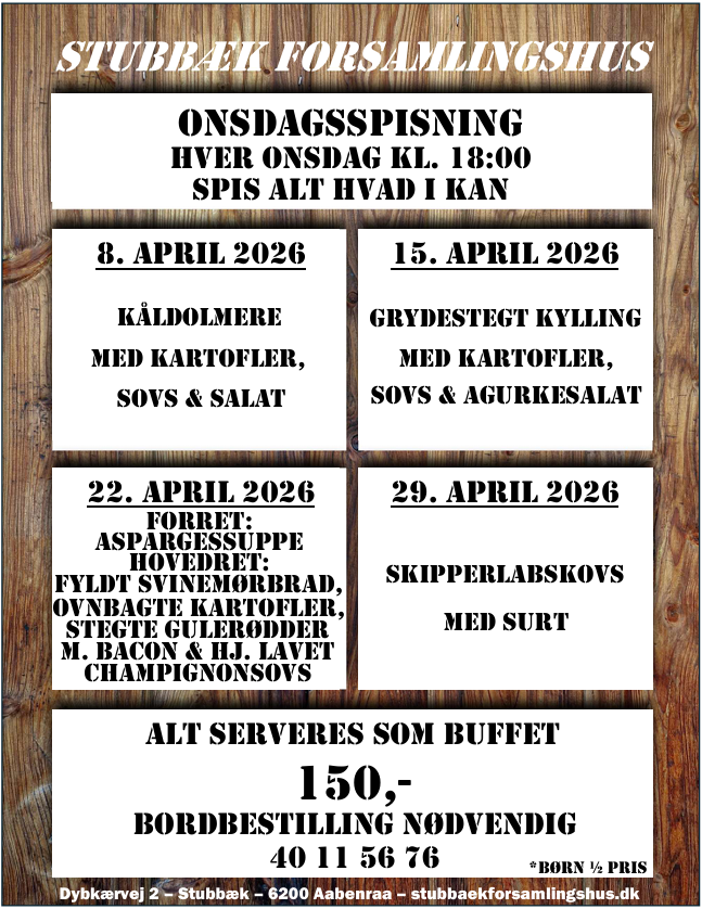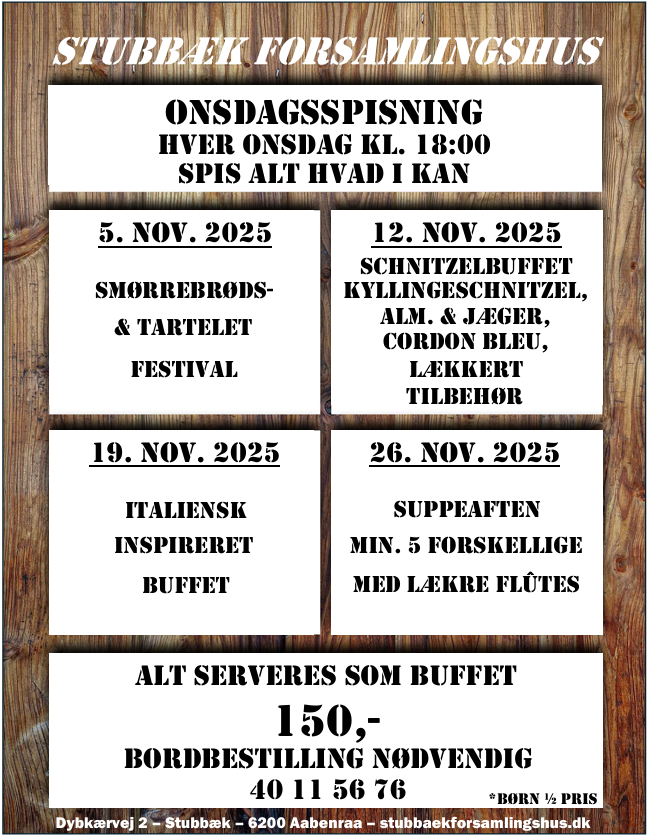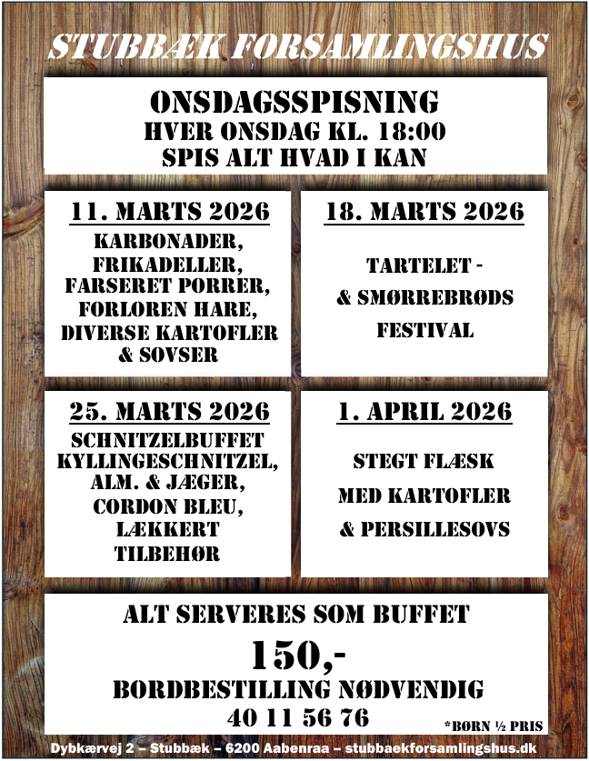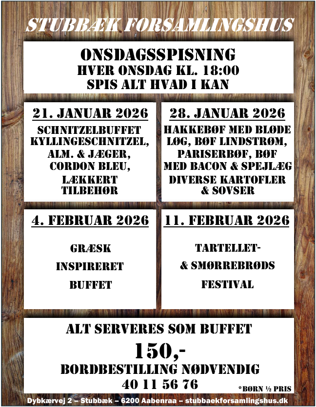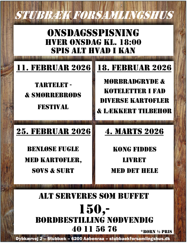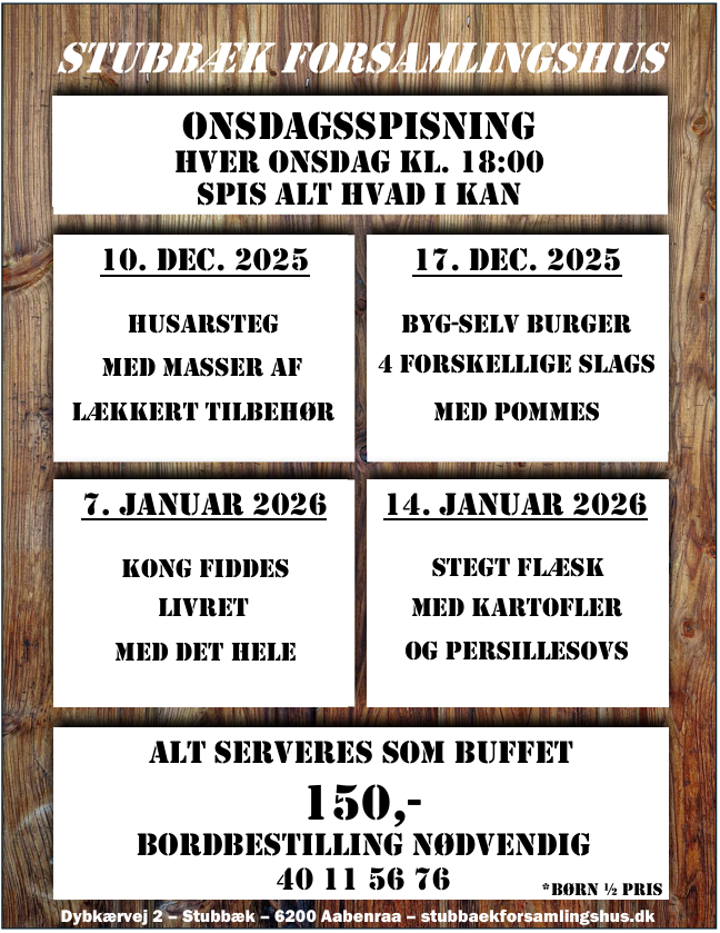 Hos Stubbæk Forsamlingshus og Selskabsrestaurant kan vi hjælpe med alle former for arrangementer; Jubilæum, fødselsdag, konfirmation, bryllup, barnedåb, firmaarrangement eller andet. Vi sammensætter en dejlig menu efter jeres ønsker og sørger selvfølgelig for alt det praktiske.